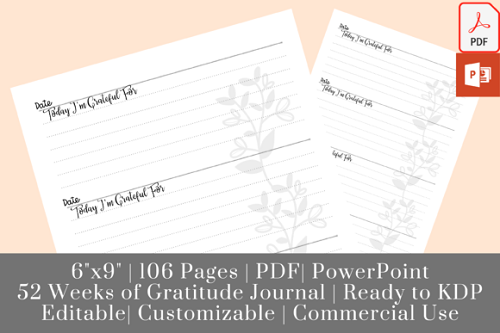 Gratitude Journal (PDF, PowerPoint) 52 Weeks of New Year Resolution, 6″x9″ with no bleed, 106 Pages, KDP Interior Ready for KDP